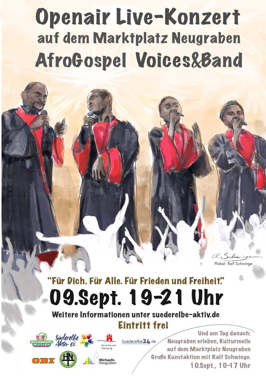 Am Sonnabend, den 9. September findet auf der Bühne von 19 – 21 Uhr das Live-Konzert von AfroGospel Voices & Band statt. Mehrere hundert Besucher werden bei Sonnenschein und einem lauwarmen Lüftchen den Abend genießen Dazu eine leckere Currywurst, ein frisch gezapftes Bier oder einen ausgesuchten Wein. Und klar, es gibt auch Softgetränke und Wasser. Ermöglicht werden die Veranstaltungen durch eine Zuwendung des Bezirksamt Harburg und zahlreiche ehrenamtliche Helfer der Michaelis-Gemeinde, der Hausbruch-NeugrabenerTurnerschaft und von Süderelbe Aktiv e.V..