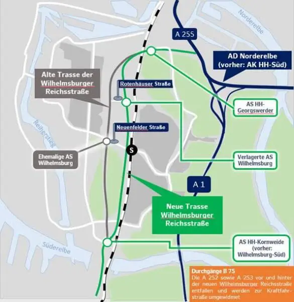 Die neue Trasse hat drei Anschlussstellen: die AS HH-Georgswerderim Norden, die räumlich leicht verlagerte AS HH-Wilhelmsburg sowie die AS HH-Kornweide (ehemals HH-Wilhelmsburg-Süd). Die neue Wilhelmsburger Reichsstraße sowie die anschließende A252 und A253 werden einheitlich zur Kraftfahrstraße B75 umbenannt. Das Autobahnkreuz Hamburg-Süd der A1 wird zum Autobahndreieck Norderelbe umbenannt. Die Abfahrt im neuen Dreieck Norderelbe in Fahrtrichtung Süden über die neue Wilhelmsburger Reichsstraße B75 wird mit HH-Elbinsel beschildert werden.